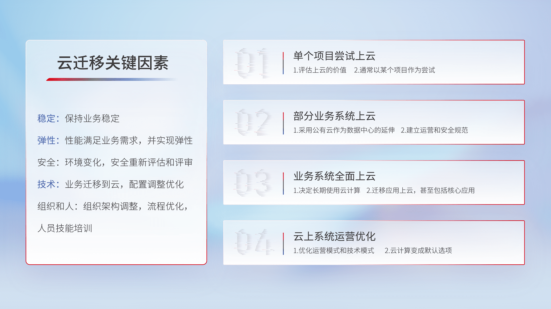 结合实际业务,,从规划设计、、、云平台选型、、云原生改造、、、数据迁移、、、集成交付,,,迁移全过程为客户识别最佳上云路径,,,做好风险识别管理,,设计网络架构、、、身份权限、、、、安全审计合规、、、操作审计、、、日志审计、、、、监控告警策略、、、、多站点容灾设计等,,对云上基础设施进行整体规划,,,提升IT治理水平,,以满足弹性、、、高可用、、、高性能的需求。。。