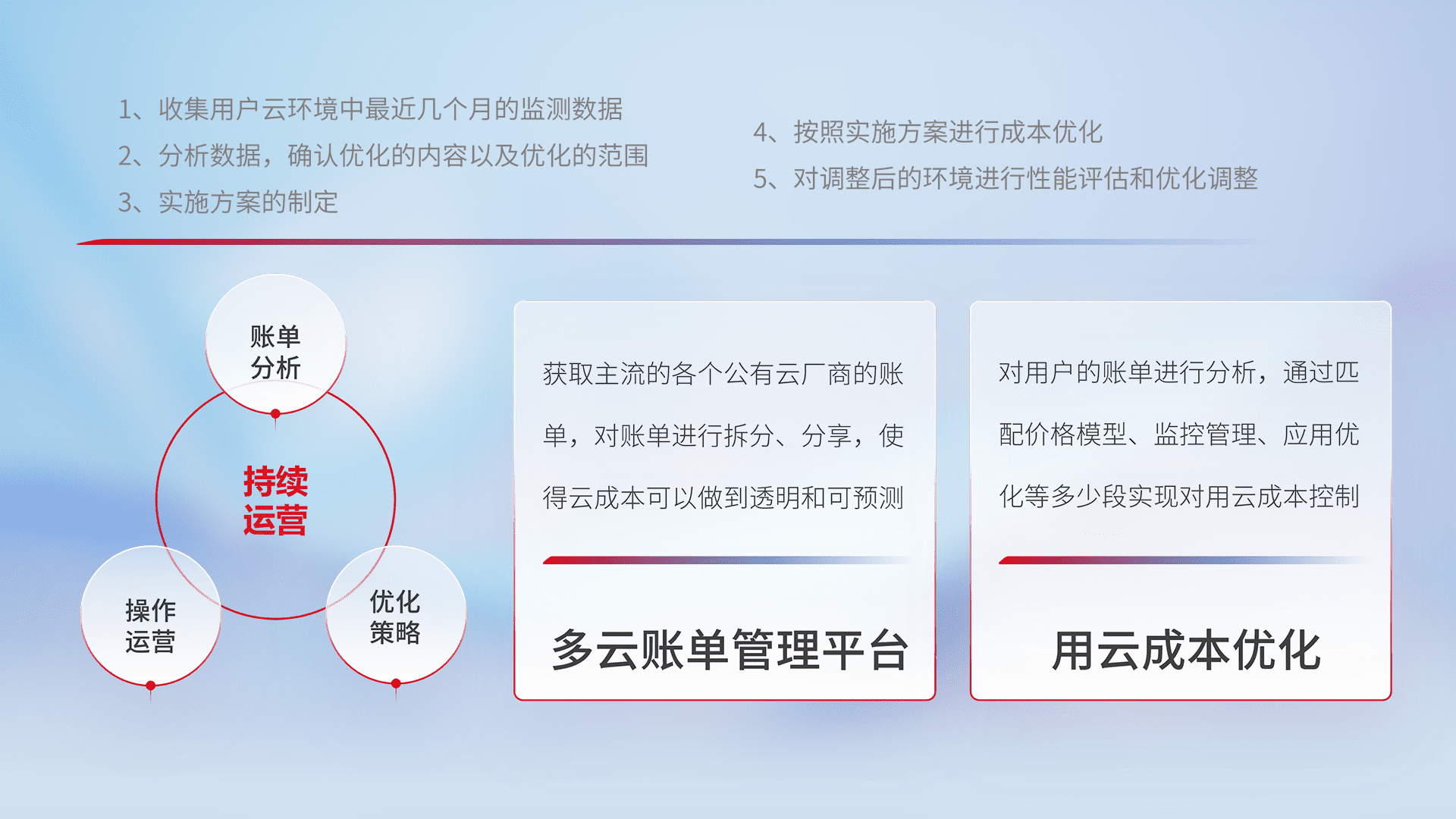 通过多云纳管,,以统一的资源数据模型把客户的云资源进行抽象和封装,,进而实现对多云资源的统一操作,,,保障云资源管理的可靠性、、、、稳定性与可用性。。量身定制化运维内容,,,配置、、、开发运维、、、补丁管理、、、备份、、、、监控、、、、认证和访问管理、、、审计和日常巡检等,,,,保障在用云过程中的可靠度,,,稳定度以及高可用率。。。